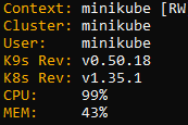 Minikube + k9s view showing 99% CPU utilization.